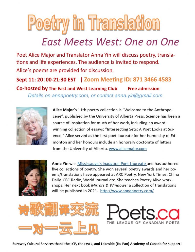Alice Major and Anna Yin will discuss poetry, translations and life experiences. They will explore how to get inspirations from science and how to write poetry with an interesting and understandable view related to science.